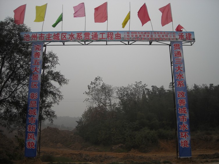 我公司承建的池州市重點市政工程——主城區水系貫通工程,已于10月18日正式開工。內容包括:疏浚河道4.54公里,(河道底寬20米,挖深3米)、生態護坡(三維土工網草皮護坡)、生態濕地、親水平臺(護砌高度達7.1~9.1米的硬護岸)、柳桉木的棧橋、棧道等。
