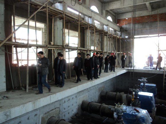 檢查組一行認真查看了施工現場,對泵站主體、進水池、出水池、機電設備安裝等進行了細致檢查,并向施工人員詳細詢問了泵站建設階段的相關技術問題。隨后又對我公司施工資料進行了檢查。